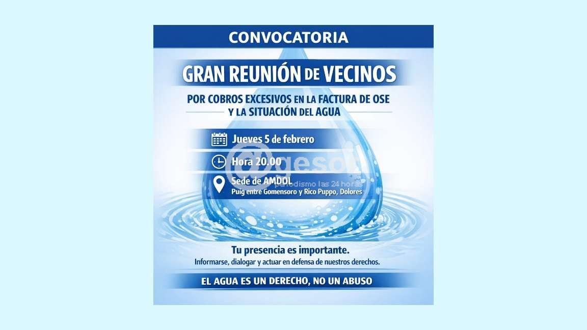 Este jueves 5 de febrero, a la hora 20.00, en la sede de AMDOL, ubicada en calle Puig, entre Gomensoro y Rico Puppo, de la ciudad de Dolores, un grupo de vecinos se reunirá con el objetivo de analizar los montos excesivos registrados en las facturas de OSE.