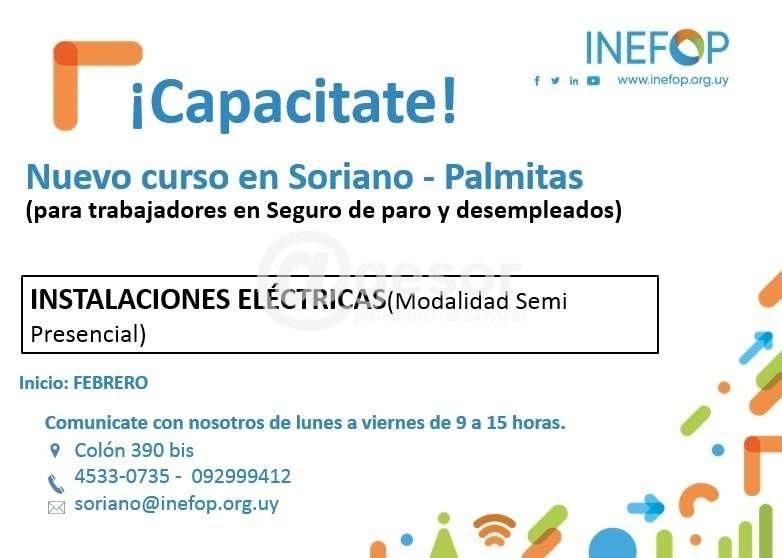 INEFOP está llamando a inscripción para nuevo curso en Palmitas sobre instalaciones eléctricas. Será en modalidad semipresencial para trabajadores en seguro de paro y desempleados.