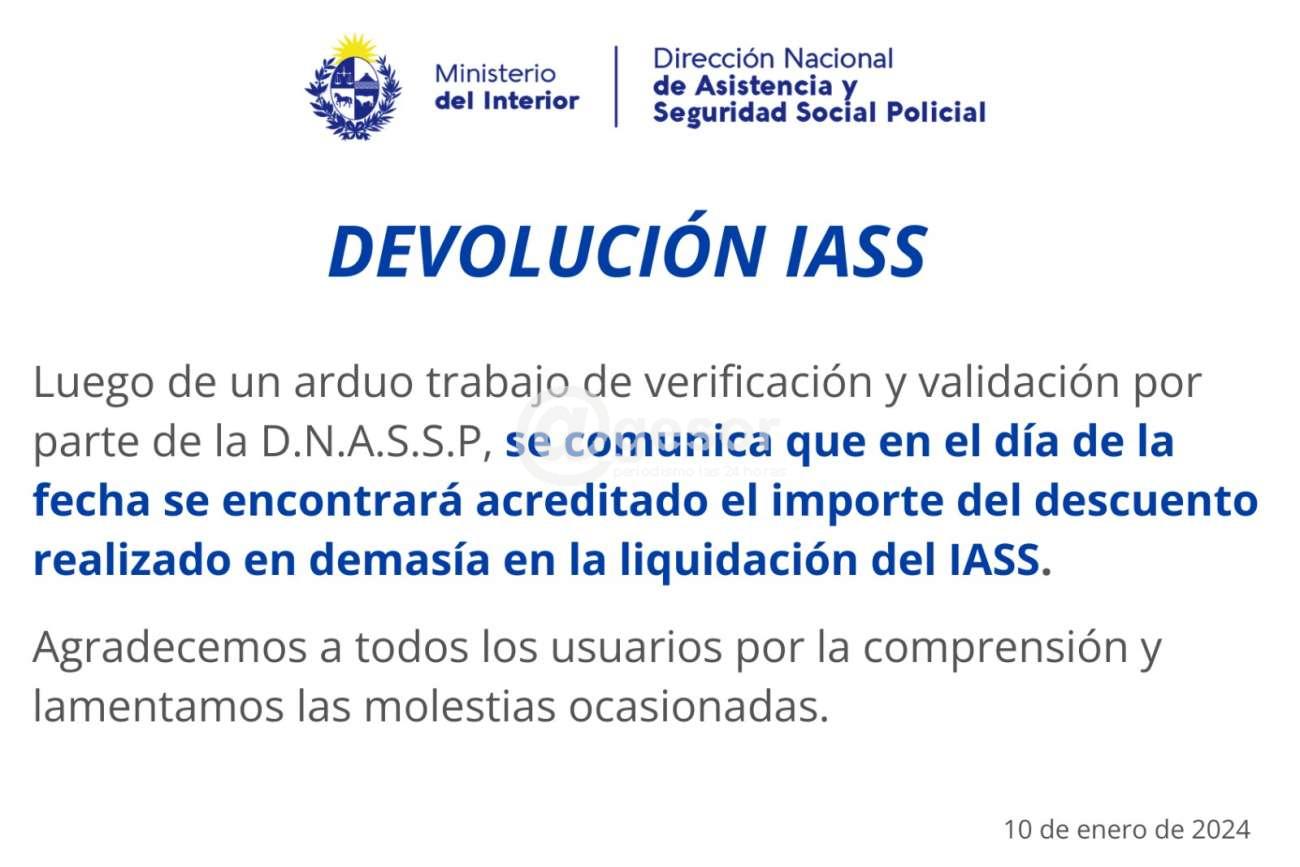 Desde la Asociación de Jubilados y Retirados Policiales de Soriano se hizo llegar comunicado en el qe se expresa: "La Dirección Nacional de Asistencia y Seguridad Social Policial (DNASSP) ha detectado diferencias en algunos descuentos de IASS efectuados por el sistema informático a nuestros usuarios.