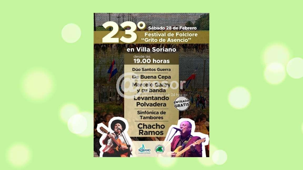 El próximo sábado 28 de febrero, a partir de las 19 horas, se realizará en Villa Soriano el festival de folclore “Grito de Asencio”, con la presencia de destacados artistas.