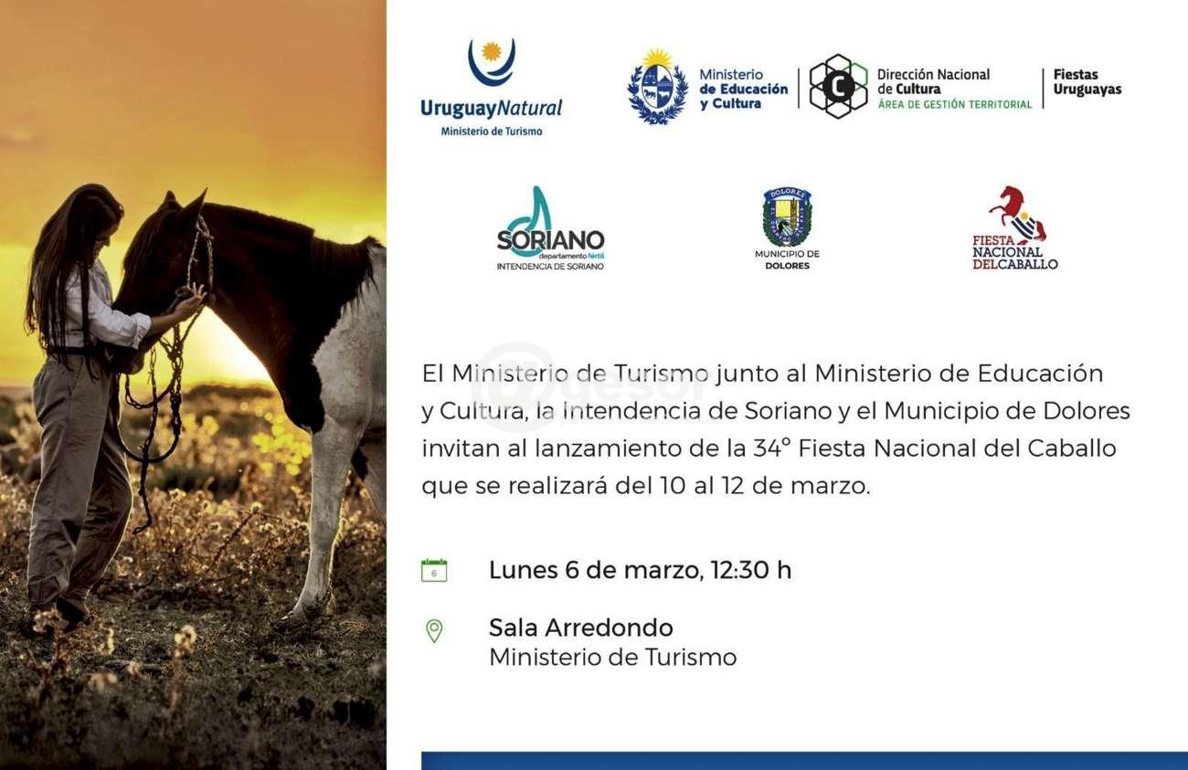 El Ministerio de Turismo junto al Ministerio de Educación y Cultura, la Intendencia de Soriano y el Municipio de Dolores, están invitando al lanzamiento de la 34ª edición de la Fiesta Nacional del Caballo que se realizará del 10 al 12 de marzo en Dolores.